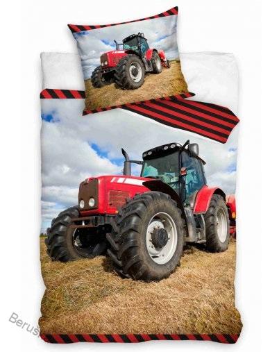 Na lícní straně povlaku přikrývky je obrázek obrovského červeného traktoru, který právě připravuje půdu na jarní sezónu